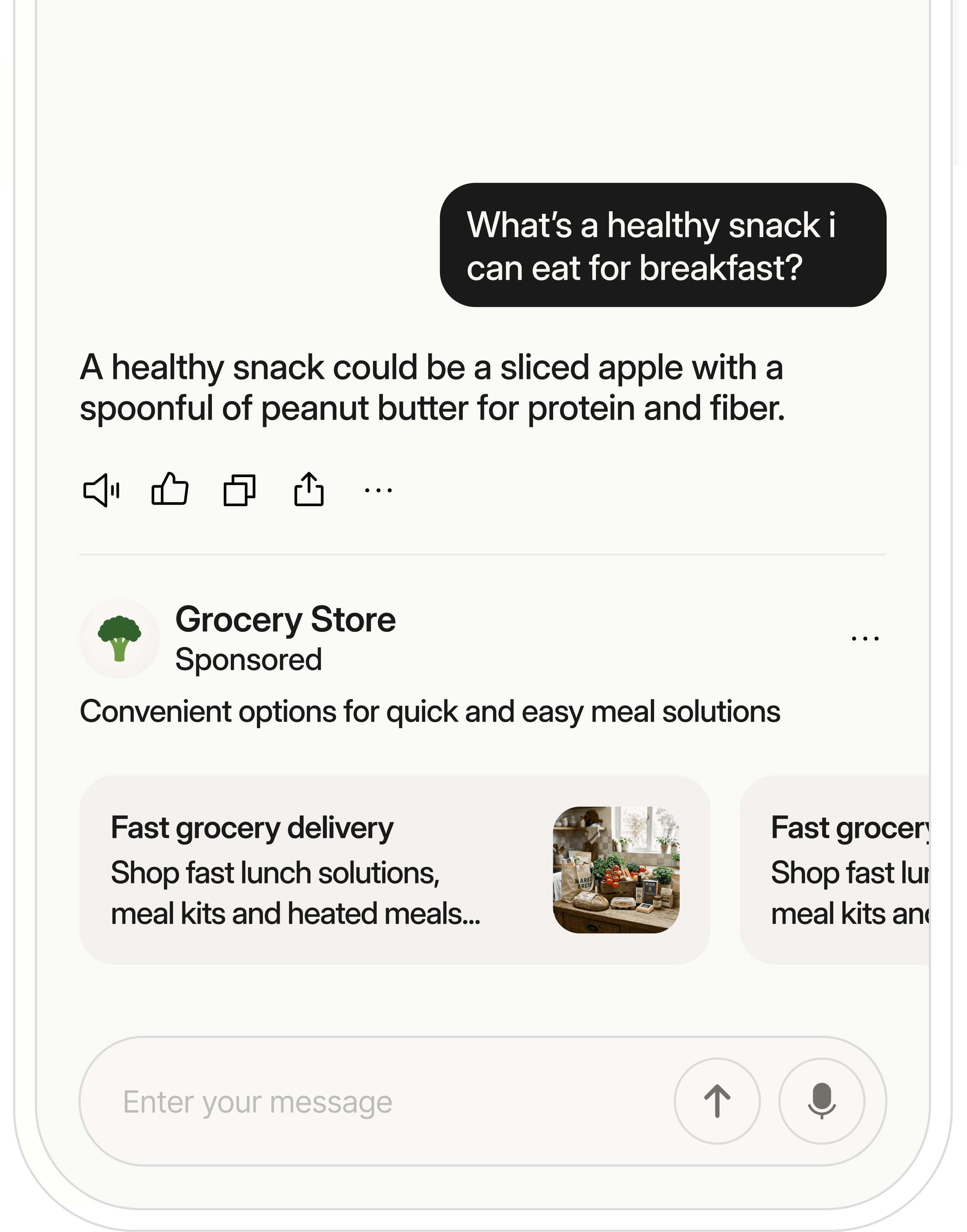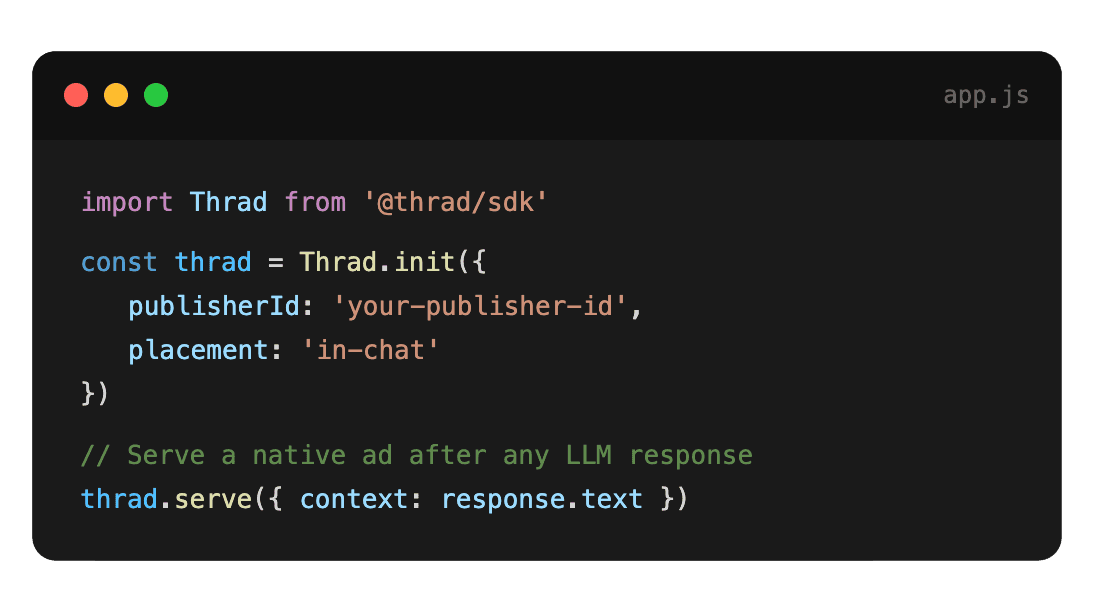 Thrad's SDK and API integrate with any AI-powered product. Whether you run a consumer chatbot or a vertical SaaS tool, our ad formats sit natively inside the conversation and match user intent in real time.